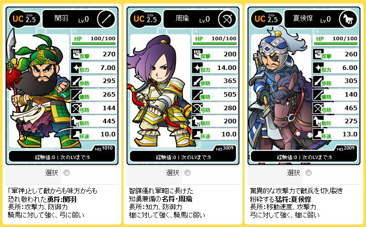 コストは一律2.5で左から槍、弓、馬